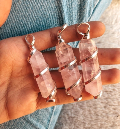 CUARZO ROSA BIPOLAR EN ALAMBRE CON BAÑO DE PLATA X2 U.